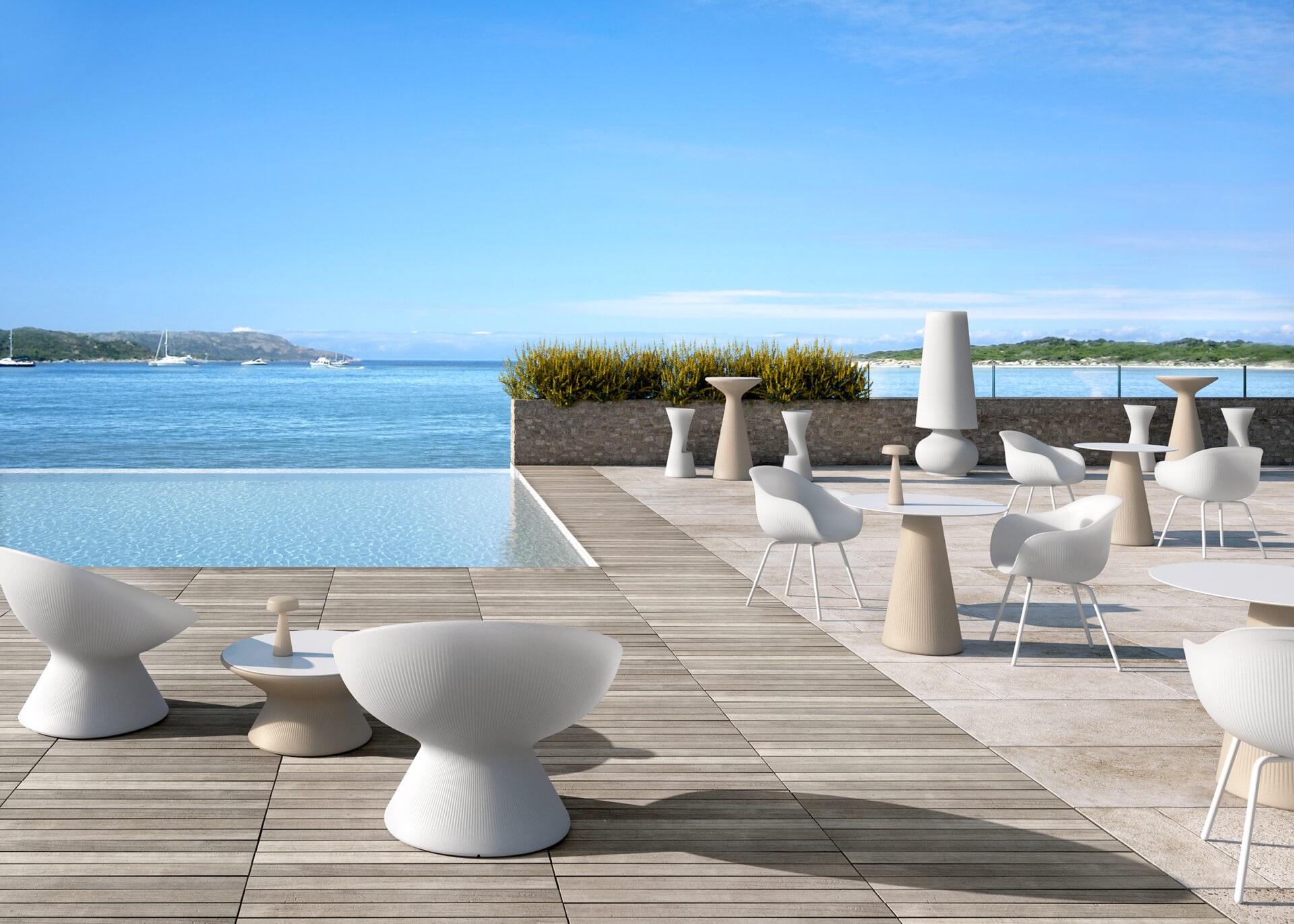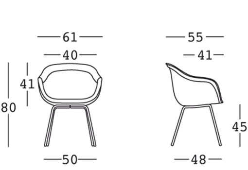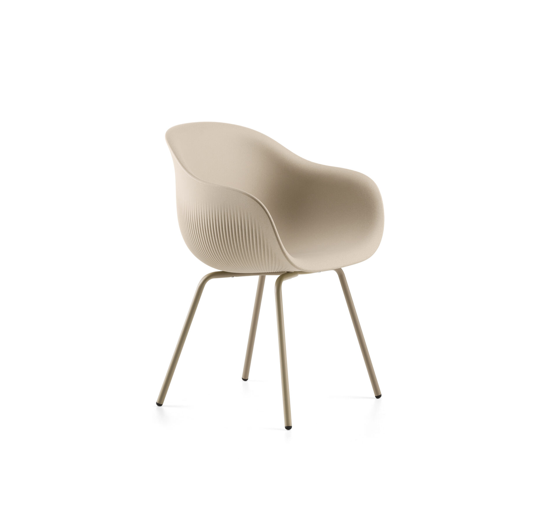 Krzesło ma smukłe linie i wyjątkową prążkowaną powierzchnię ze specjalnymi wykończeniami nawiązującymi do naturalnych materiałów. Nogi z malowanego metalu.