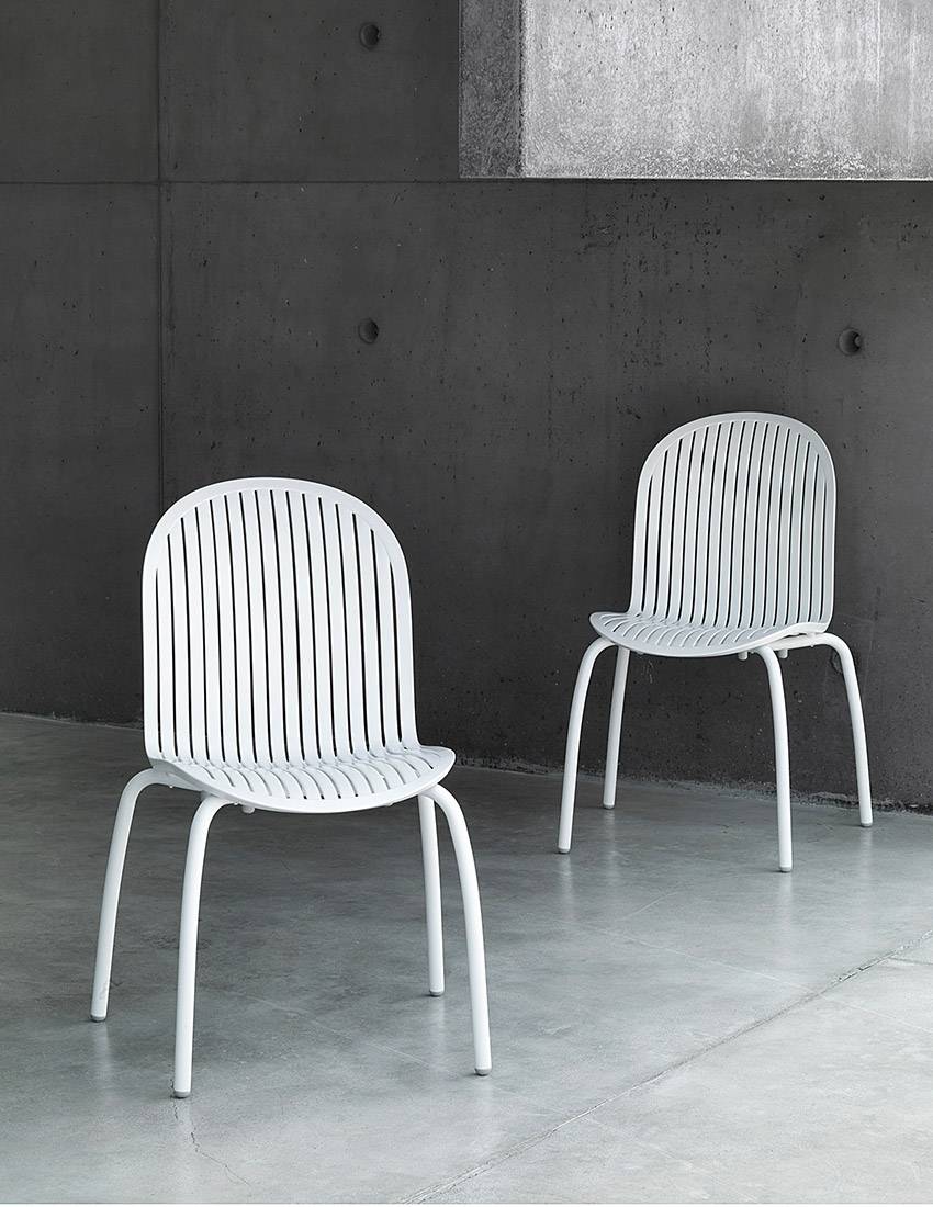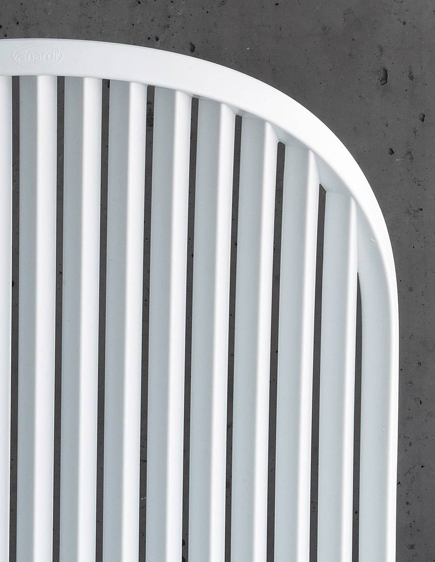 Krzesło bez podłokietników. Materiał: polipropylen z dodatkami UV, jednolicie zabarwiony. Nogi z powlekanego aluminium. Matowe wykończenie. Z antypoślizgowymi nóżkami. Żywica nadająca się do recyklingu.