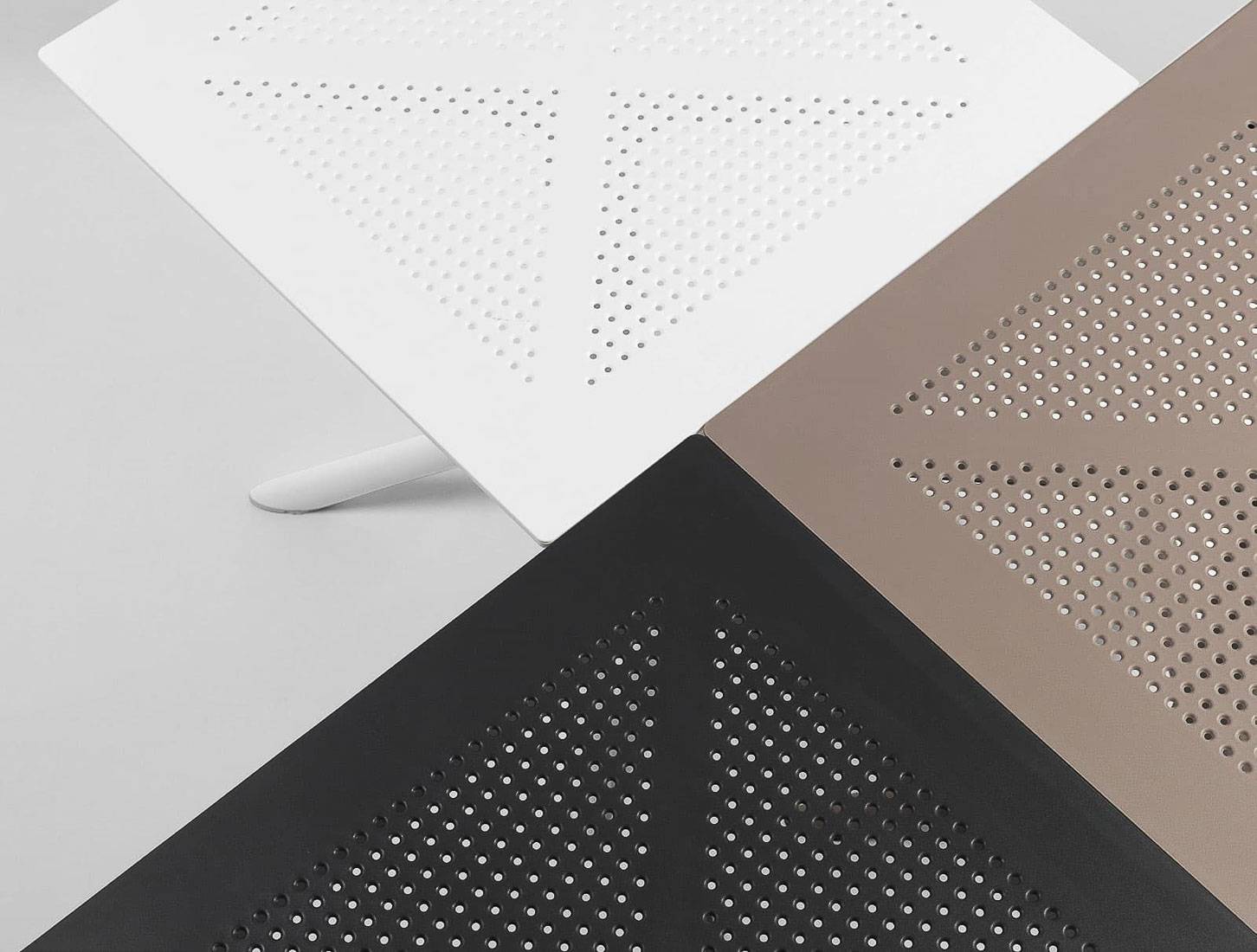 Specjalnie zaprojektowany, aby zajmować bardzo mało miejsca, Clip to profesjonalny kwadratowy stół z żywicy z włókna szklanego, centralny wspornik z czterema szprychami i blat DurelTop, z fotograwerowanym okrągłym perforowanym wzorem.