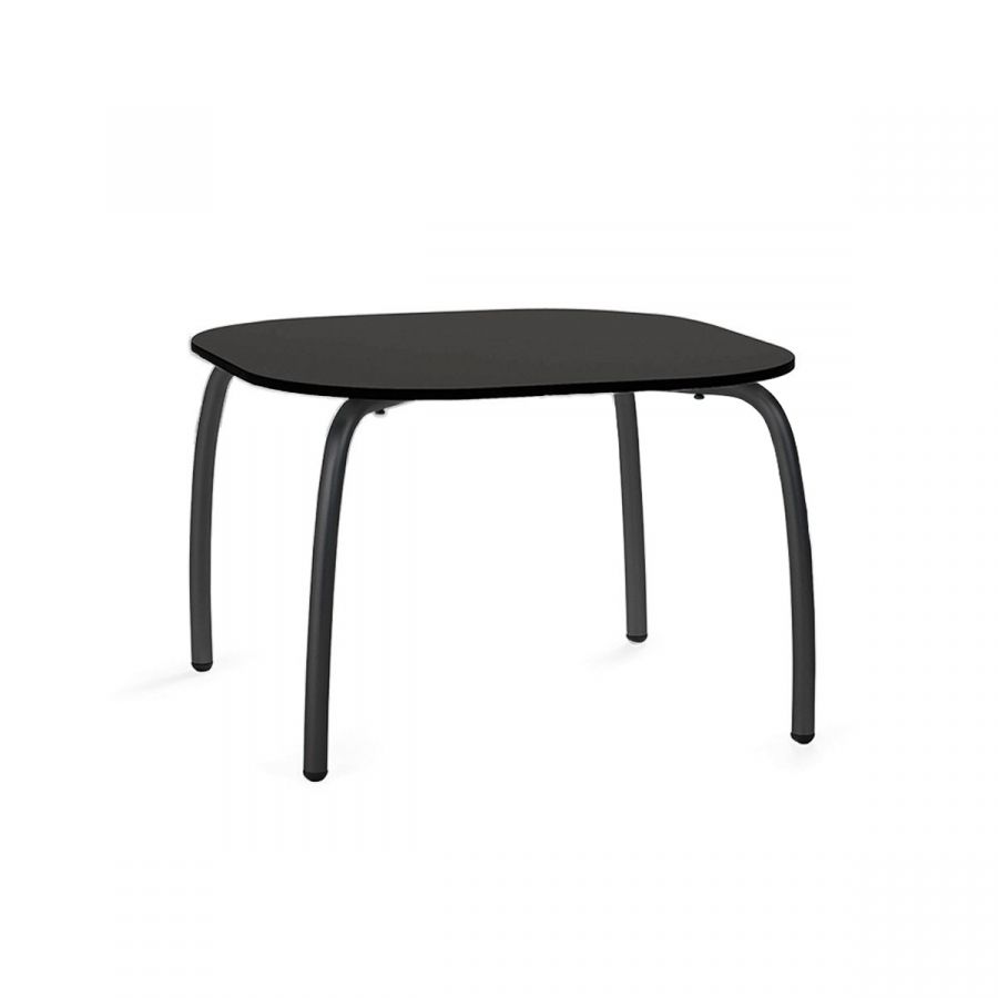 Niski stolik z blatem z laminatu HPL o grubości 10 mm i aluminiową podstawą o płynnym i aerodynamicznym kształcie przypominającym wodne kwiaty.