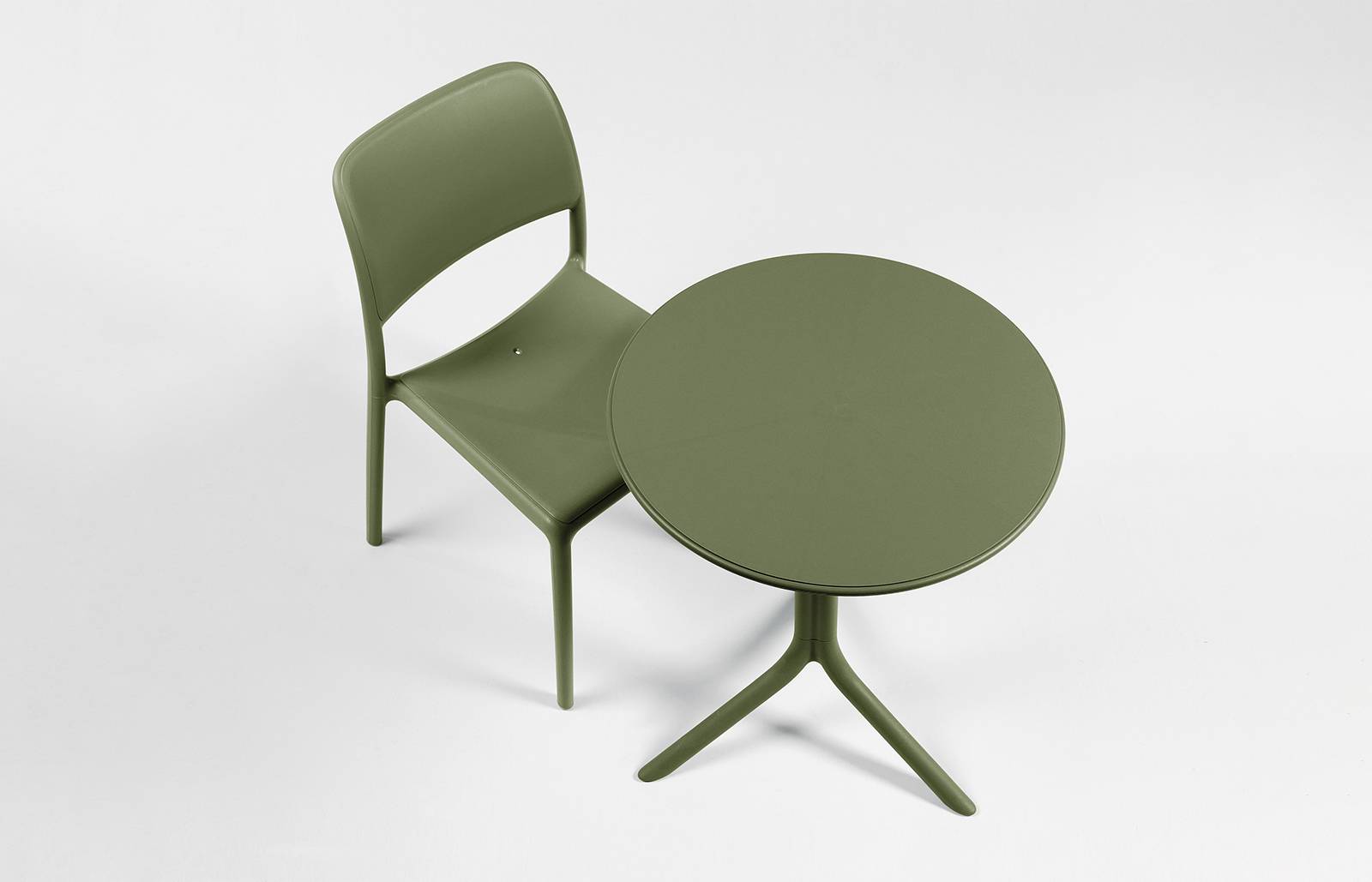 Stół z kolumną środkową i 3 nogami. Materiał: jednolicie zabarwione żywice polipropylenowe z włókna szklanego z dodatkami UV. Podzielny. Matowe wykończenie. Z antypoślizgowymi nóżkami. Opcja podwójna wysokość: 40 cm / 76,5 cm. Żywica nadająca się do recyklingu.