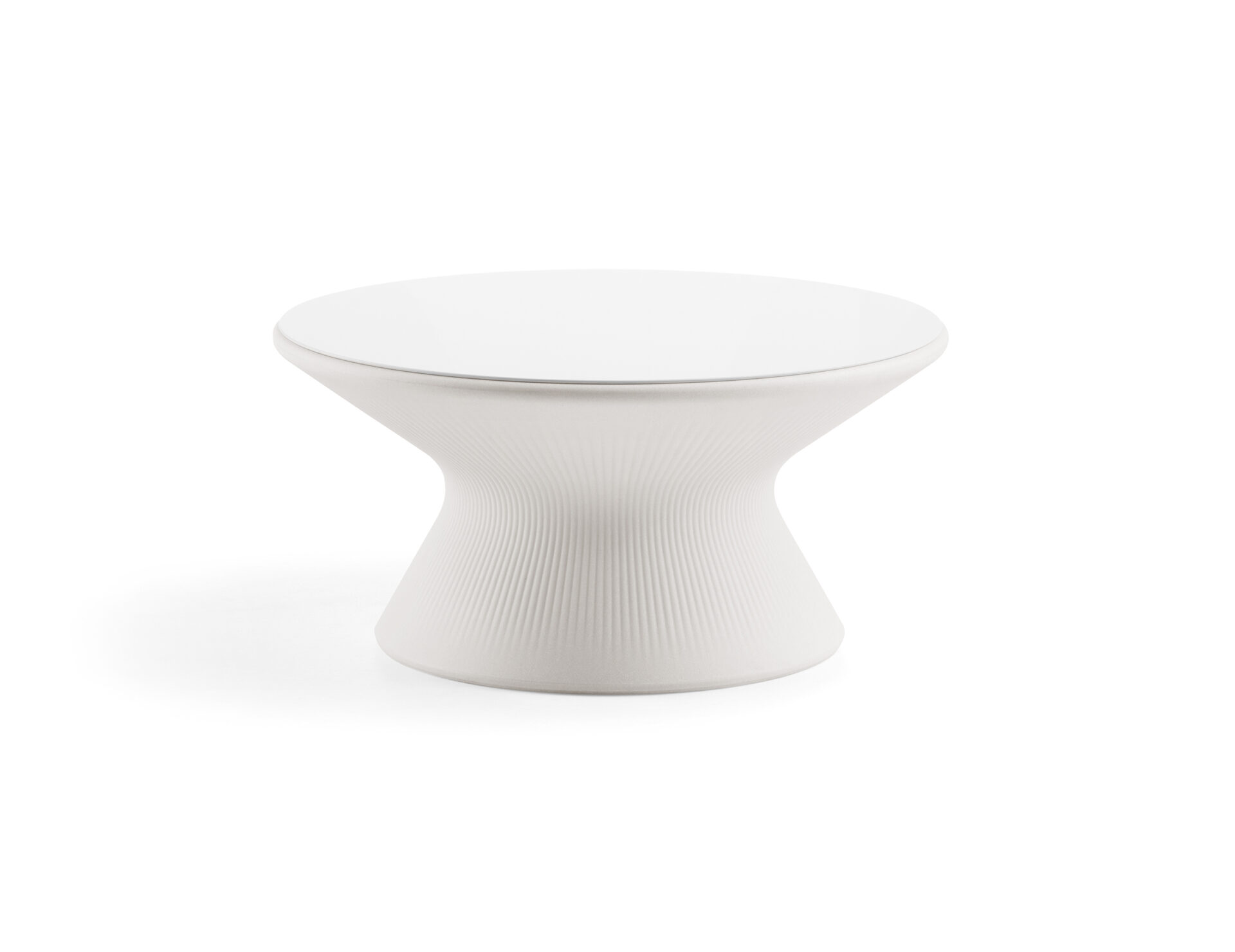 Niski stolik, który wymaga osobnego doboru blatu z HPL. Jej linia jest gładka, a powierzchnia jest wyjątkowo prążkowana i posiada szczególne wykończenia przypominające naturalne materiały. Blat nie jest wliczony w cene.